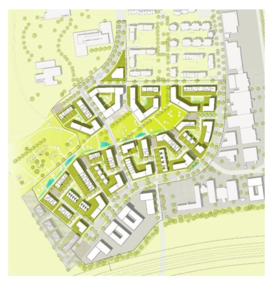 Additionally, various control levels define the types of experiments: controlled, observational and quasi-experiments []. This research integrates observational methods to perform objective experiments with software tools. Observational methods including project monitoring, case study, assertion and field study were used to collect the data in the development of the project []. The case study collects data while monitoring certain attributes and their measures, which are defined using the ISO framework. The project chosen to perform experiments is a neighbourhood on the outskirts of the city of Ulm, which integrates various climate adaptation measures. Figure 2 illustrates its site plan, with retention swales, green infrastructure and a water retention pond to handle 100-year climate events. Currently, living quarters are vulnerable to climate events due to the social structure requiring innovative and effective decisions.