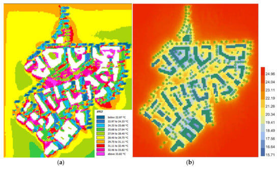 Comparison of UTCI simulations: (a) ENVI-met; (b) Ladybug (source: authors).