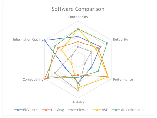 The results from the objective experiments revealed the limitations of each software tool. The evaluation of software quality according to ISO 25010 uses a five-grade system to rank software tools. Table 6 gives an overview of the software tools that meet most of the ISO requirements. Scores are given in a comparative manner, ranking five software tools from the highest score, 5, to the lowest, 1. The highest score was given to the GreenScenario tool, and the lowest score was given to CitySim. However, there was only a small difference between Ladybug, AST and ENVI-met. Nonetheless, overall scores do not reflect the capabilities and limitations of each software tool. Therefore, Figure 7 presents a comparative analysis of the capabilities and limitations of software tools based on the ISO 25010 framework. The results reveal that functional suitability is the strength of GreenScenario and AST, while ENVI-met is the strongest in information quality. Despite the strength in performance and operability, ENVI-met and AST reveal some limitations regarding incompatibility and reliability. Due to its simplicity, AST can be efficiently used for climate adaptation scenarios; however, the results on information are rather limited. To conclude, these results show that the time invested to produce simulations ensures better information quality.