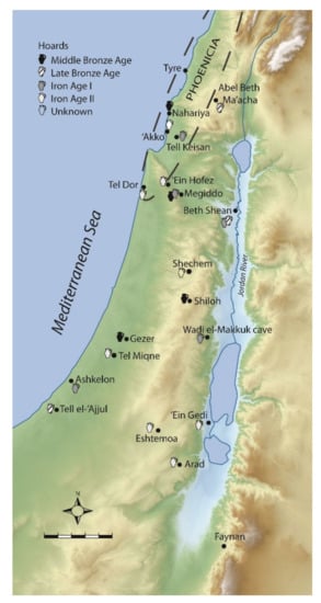 Map of the Southern Levant showing sites with Bronze and Iron Age silver hoards. (Drawing by S. Matskevich; Reproduced after []).