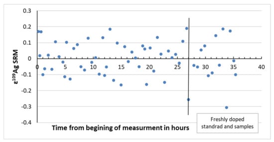 All analyzed samples and standards were prepared for analysis on the day of use. This is because mixed solutions containing Ag and Pd are unstable, and Ag concentrations and isotope ratios were observed to change with time ([], p. 2158). The samples were measured continuously from 26 February 2019 12:49 to 28 February 2019 00:32 using MC-ICP-MS (Neptune Thermo; Thermo Fisher, Bremen, Germany). We used four measurement blocks, each containing 10 acquisitions of 8.389 s integration time (one integration per cycle, 40 data points overall). 107Ag was measured on the center cup and used for peak centering. 111Cd was also measured to correct for interferences on Pd and had a typical response of 1.5E−5 volts or less. The 107Ag, 109Ag, 105Pd and 108Pd yielded signals that ranged between 1.5 and 2 volts. A mass bias correction was calculated using 1.18899 as the true value for 108Pd/105Pd. Operating conditions were optimized for maximum analyte signal intensity. On 27 February 2019 15:27, a new, fresh batch of doped samples and standards was used. In the course of the analysis, 59/61 of the ɛ109Ag values were stable and varied within ±0.2 ɛ109Ag (Figure 2).