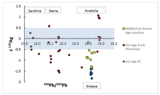 206Pb/204Pb versus ɛ109Ag in silver items from Bronze and Iron Age South-Levantine hoards. The results are marked according to the different time periods: yellow squares—Middle/Late Bronze Age transition; red circles—Iron Age IIA–B (Phoenician); blue rhombuses—Iron Age IIC. For Pb isotopic ratios and the content, context and chronology of the hoards, see [,,,].