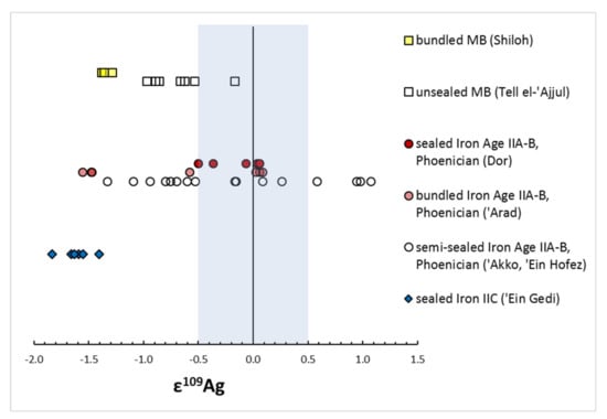 The results, as demonstrated in Figure 5, show that unsealed and semi-sealed silver has a wider range of ɛ109Ag values compared with bundled and sealed silver. Semi-sealed silver, which was hoarded in open ceramic vessels, displays the widest range of ɛ109Ag values. This observation does not alter our original conclusions that Phoenician silver is less fractionated than Middle/Late Bronze Age and Iron IIC silver, as the same conclusions can be reached when considering sealed and bundled silver only (the colored items in Figure 5).