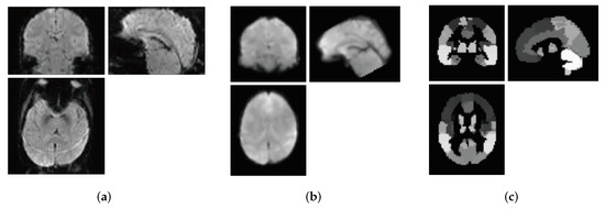The second part of the preprocessing is the registration of the normalized image. The registration step clusters the image to several regions accordingly and provides a “mask” that indicates the coverage of regions. Among various registration methods, we use AAL2 from the Montreal Institute of Neurology (MNI) brain space Automated Anatomical Labeling atlas (AAL) [57]. FMRIB Linear Image Registration Tool (FLIRT) is used for registration, which is an automation tool for brain image registration in the FSL software library. This registration step divides the brain into 94 regions of interest (ROI). Note that the above steps do not reduce the dimension of data and the original data can be recovered by reversing the process. An example of normalization and registration of fMRI images is shown in Figure 1.