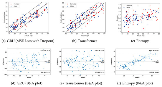 In addition, we provide Bland–Altman plots to visualize the results. The Bland–Altman plot shows the consistency between two different measurements. Here, we use the actual age of the test data sets as a known measurement and the predicted age as another measurement value. Figure 4d,e show Bland–Altman plots of the GRU model and Transformer model. What needs attention here is the processing of the entropy results. Since the entropy value is not an age estimation, we first find a linear regression model that estimates an age from the entropy value. Figure 4f shows a Bland–Altman plot of estimated age from entropy and the actual age.