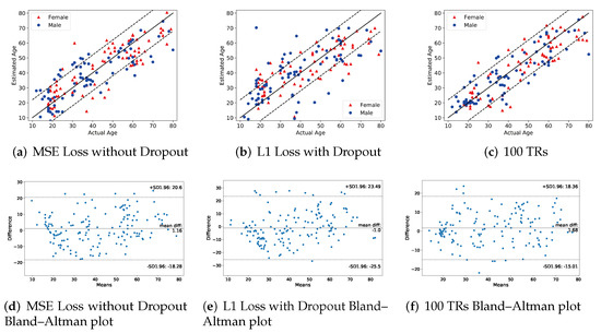 As we mentioned in the above section, we employ the dropout technique to prevent overfitting. Figure 5a,d show the estimation result of the exact same model without dropout. It can be seen that some estimations deviate from the actual ages, where the proposed method with dropout shows a robust estimation. The correlation coefficient without dropout is , which is smaller than the correlation coefficient of the proposed model in the presence of dropout. This clearly shows that the dropout suppresses the generalization error, especially in our case where the size of the dataset is small.