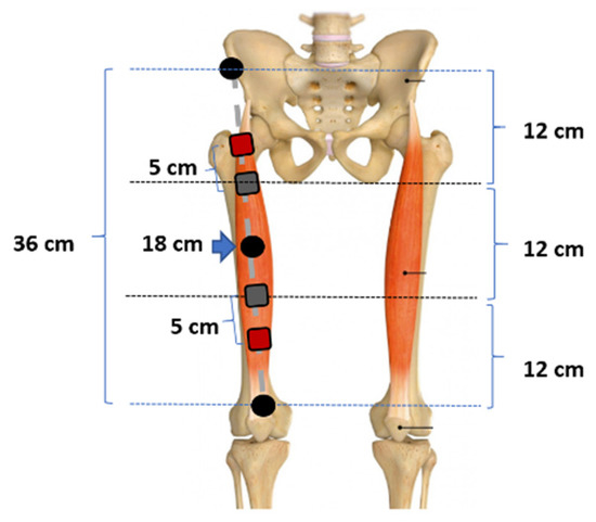 Figure 1. Rectus femoris muscle-localized BIA electrode placement example for 36 cm between anterosuperior spine and patella.