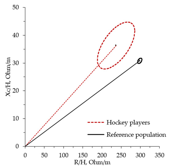 RXc mean graph. The 95% confidence ellipses for the mean impedance global vectors of hockey players (dotted line ellipse) and the healthy male reference population (solid line ellipse with vector) obtained from Piccoli et al. [40] are shown.