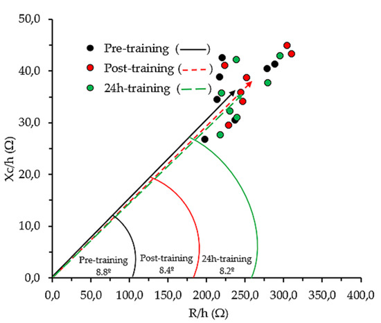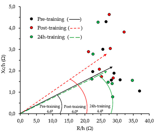 At POST24, R/h significantly decreased by 4.8 ± 3.1%, a fact that, in conjunction with the recovery of body weight and the shortening of the length vector (−4.8 ± 3.2%), indicated that the players were not dehydrated anymore and had recovered the fluid lost during training. Still, there were no significant changes regarding Xc/h at POST24H. However, regarding PRE, the direction of the vector changed since there was a significant difference between the PRE and POST24H PhA; hence, it was supposed that the ICW/ECW ratio had changed. In the sports field, a decrease in PhA can mean conditions of fatigue [54] or cell damage [20,21,22,23,24], thus this information could help physical trainers to assess the workload in their players.