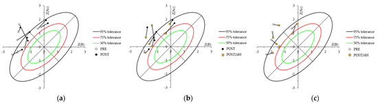 Individual global vector score values for the RXc score graph with 50%, 75%, and 95% tolerance ellipses of the male healthy reference population [40] plotted for: (a) PRE–to–POST, (b) POST–to–POST24H, and (c) PRE–to–POST24H. Z(R), resistance Z score; Z(Xc), reactance Z score.