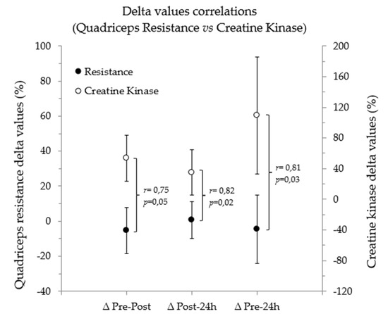 However, it is important to be cautious with this correlation since, as was previously mentioned, the muscle-localized R/h changes were not significant. Therefore, we must ask ourselves to what extent the correlation between a significant change and a non-significant change is reliable. It could be possible in the case of athletes who were more sensitive to CK than R/h adaptations.