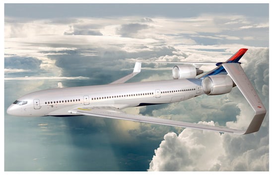 Regarding novel aircraft configurations, and beside other embodiments (e.g., flying wing [1], strut-braced wing aircraft [2]), one can cite the Box-Wing Aircraft (BWA) concept [3] (see Figure 1). Based on the pioneering works by L. Blériot and G. Voisin [4,5] (1906), this concept was later rationalized through the Prandtl–Munk theory [6,7], according to which an aircraft with a closed wing system should offer better aero-structural performances than a conventional ‘tube-and-wing’ configuration. Indeed, different from a conventional aircraft whose lift is produced by a single wing, a box-wing aircraft relies on multiple lifting surfaces (wings, but also horizontal tail) that are connected one to the others, with these connections reducing the drag induced by wingtip vortices. The benefits are expected to be multi-fold, namely (i) more lift produced (i.e., more payload allowed and/or shorter wingspan required), (ii) less induced-drag generated (i.e., less fuel consumption entailed) and then, (iii) higher structural integrity (i.e., less weight from structural reinforcement)—all of which would ultimately lead to better performances and thus lower emissions.