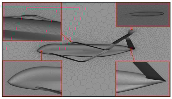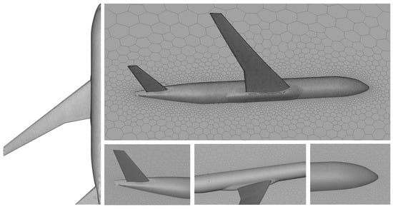 Again, the problem being symmetric, only one half of the aircraft is considered. The computational domain extends by approximately 44 × 9 × 13 semispan (bref/2, bref = 60 m) in the axial, lateral and vertical directions, respectively. This domain is meshed with an unstructured grid that is composed of polyhedral elements. Based on a specific grid convergence study, the mesh is capped to 1.2 million cells, for a convergence met at 0.9 million. The resulting grid (cf. Figure 12) is such that 90% of the cells exhibit a skewness of 0.68–0.78 whereas 2% of cells have an orthogonality of less than 0.3. The smallest cells are again distributed along the aircraft skin, with a maximum y+ value of 1500. This is again deemed to be acceptable in view of the computational strategy deployed (wall function, realizable k-ε turbulence model, etc.), especially considering its preliminary validation through the CRM cases of the previous section.