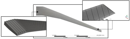 This FEM model (namely, the V15 version) comes as a shell-based structure that includes implicit stiffening elements such as main spars, skins, more than 50 ribs, etc. (see Figure 5). Following [46], the material adopted for the entire wing is aluminum (i.e., density: 2780 kg/m3, Poisson Ratio: 0.33, Young’s Modulus: 7.31 × 1010 Pa, yield Strength: 4.20 × 108 Pa.).