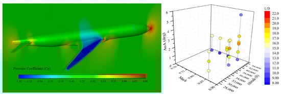 CRM aircraft in various flight conditions. (Left): Steady pressure (Cp coefficient) on and around the aircraft in cruise flight conditions S1 (M = 0.85 at 44,000 ft) with an angle-of-attack α = 5.5°. (Right): L/D values obtained for the various flight conditions and aerodynamic settings (α).