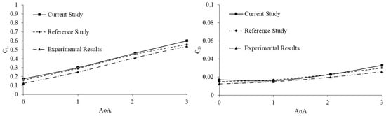 The good agreement of the present simulations with reference data is further highlighted in Figure 8, which depicts the lift and drag coefficients obtained under the S1 flight condition for various angles of attack (α ~ 0° to 3°), comparing them with those coming from [48]. The agreement is fairly good, with the present and reference simulations almost collapsing while closely matching the experiments.