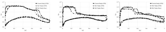 An additional and more qualitative comparison is provided in Figure 9, which displays the chordwise distribution of the pressure coefficient (Cp) around the main wing, as obtained under the S1 flight condition and a higher angle of attack (α = 5.5°)—following [48]. As observed in the latter reference, beyond a limit angle of attack of α = 3°, non-linear effects mostly drive the lift creation (and, thus, the structural deformations) experienced by the wings. This goes along with the formation and upstream migration of a shock that initially extended towards the wing tip. One can see that the shock presence is captured by the simulations and the experiment, as revealed by the respective Cp distributions that are plotted here at three relative positions from the root (η = (y − yroot)/(ytip − yroot)). Similar to the reference computation [48], the present simulation agrees reasonably well with the experimental data [48], despite some noticeable deviations around the shock location. At this stage, it is worth underlining the inherent difficulty of capturing shocks using standard CFD approaches such as the one used here (e.g., classical 2nd order schemes), which makes it usually challenging to simulate such types of transonic configurations.