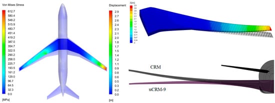CRM aircraft in flight condition S2 (M = 0.85 at 37,000 ft) with an angle-of-attack α = 2.25°. (Left): Stress distribution (left wing) and deflection (right wing) exerted by the aircraft planform. (Right): wing deflection (top) and comparison with that of [46] ((bottom): in-flight deflected and undeflected i.e., uCRM9).