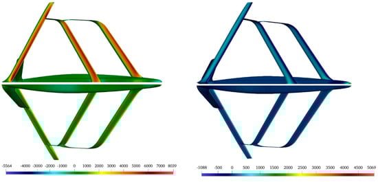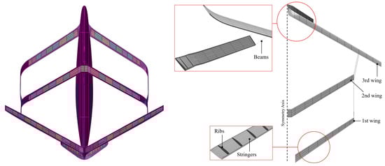 First, the three wings and V-tail are assumed to be the primary load-carrying structures. The latter come as an ensemble of shells that are classically reinforced using ribs, spars, stringers, connections, etc. All of these structural elements exhibit various thicknesses, which are chosen so as to offer the best trade-off in terms of structural characteristics versus weight penalty. For instance, the wings and V-tail comprise a total of 40+ ribs overall, as well as stringers and spar caps (cf. right side of Figure 13). All are wrapped up with shells of thickness 7 mm, the stringers and spar caps being modelled using rods of equivalent radius 17.8 mm. The connections between wings and wingtips (or between the third wing and the V-tail) are assumed to be flexible bar structures (cf. right side of Figure 13). The wing-to-wing junctions are idealized and modelled as beams, using connecting rod elements of 20 mm radius. For a better realism (and in contrast to previous structural analyses of the PrandtlPlane [17]), the third wing root is here allotted some degrees of freedom, i.e., it is free to move in the vertical and axial directions. For a fair comparison, the material chosen is aluminum again, i.e., it fits with the one previously used for the CRM aircraft structural study. Based on the above, an unstructured FEM mesh is generated, which gathers a total of 0.46 million of elements against a total 0.3 million of nodes. The FEM elements are of variable types and of maximum cell size 15 × 10−2 m (i.e., bref/400).