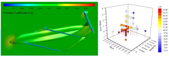 BWA/SL aircraft in various flight conditions. (Left): Steady pressure (Cp coefficient) on and around the aircraft in cruise flight condition S3 (M = 0.7 at 43,000 ft) with an angle-of-attack α = 0°. (Right): L/D values obtained for the various flight conditions and aerodynamic settings (α).
