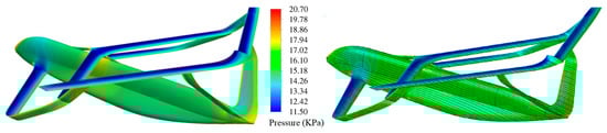 A more qualitative description of the aerodynamic performance by the CRM aircraft in such a cruise flight condition S1 with α = 2.05° is given in Figure 7. This figure depicts the distribution of both the lift and drag forces on the aircraft skin. In particular, one can notice how the lift is mostly produced by the wings (as expected), being distributed rather heterogeneously over their area. On the other hand, the drag is mostly generated by those regions of the wings’ suction side that are located close to the fuselage—which is due to the interference effect produced by the latter.