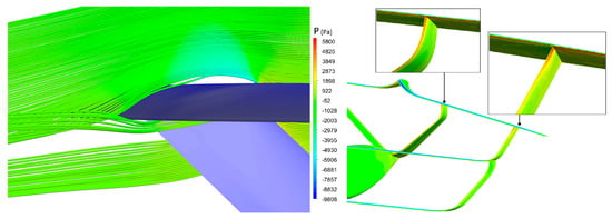 BWA/SL aircraft in flight conditions S3 (M = 0.7 at 43,000 ft) with an angle-of-attack α = 0° (left) and S1 (M = 0.85 at 44,000 ft) with angle-of-attack α = 3° (right). Flow dynamics at the outboard, straight junction of third wing, with swirling streamlines (left) and absolute pressure (right).