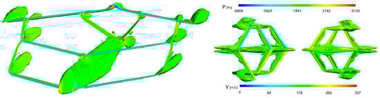 This being said, a more prominent source of drag was observed to be entailed by (i) the third wing free tip, (ii) the bottom part of the first and second wing tip junctions, and (iii) the rear fuselage. These regions are characterized by an excess of vorticity, as shown in Figure 19, which depicts the instantaneous vortical flow structures around the aircraft (plotted here as Q-criterion iso-surfaces).