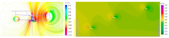 From a more global perspective, these localized swirls can also be seen as a by-product of the downwash effect that is unavoidably entailed by each wing. The subsequent flow deflection is being counteracted by the clean airflow that is located on the outboard part of the wing, which then results in circulation and vortical effects. This is illustrated on the left side of Figure 20, which depicts the flow circulation experienced by the BWA/SL aircraft in its nominal cruise flight condition (S3), as plotted in the vertical planes passing by the bottom, bent tip junctions of either the first or second wing. Figure 20 also reveals the relative importance of the downwash effect, which is here measured as the ratio between the vertical and axial components of the airflow velocity. As can be seen, each one of the three wings logically entails some downwash, deflecting the flow downward. Even though this deflected flow does not directly impinge on the downstream wing (which is purposely located above), it is likely to degrade its aerodynamic performances. Such degradation, however, is difficult to assess. For instance, it was seen that the lift regularly increases (by approximately 7%) from one wing to its aft counterpart (including when they are of the same span, e.g., the first two wings). This tend to indicate that the flow degradation entailed by the successive downwashes is not too critical, even though it undoubtedly exists.