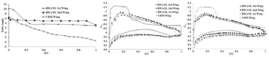 At this stage, it is worth mentioning that one cannot easily discriminate the various aerodynamic side-effects identified above. In particular, it is difficult to isolate their respective (negative) contribution to the overall aerodynamic performance, e.g., the regular decrease in the L/D ratio from one wing to another. This being said, these aerodynamic side-effects of the present BWA/SL planform are expected to be partly mitigated through further optimization of its planform, which is the subject of an ongoing study. This primarily concerns the design of the BWA/SL wings section, which should be improved. Indeed, whereas the highly optimized CRM wing involves supercritical airfoils, its BWA/SL counterparts rely on much simpler airfoils, of handmade design. Moreover, both the CRM and BWA/SL wings vary considerably in their respective twist (see left side of Figure 21). Indeed, the CRM wing exhibits a twist angle whose evolution along the span is constantly varying, and whose value is prominently negative (such a feature being desirable for both structural and stability reasons, e.g., enhanced washout effect providing the aircraft continued aileron control and some resistance to spin). Conversely, the BWA/SL wings are characterized by a quasi-constant twist, which is always positive (thereby producing more lift at zero angle-of-attack) and can be rather high (i.e., more prone to induce flow separation and, thus, higher drag).