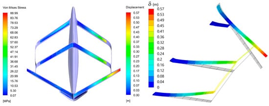 The structural analysis is conducted for the flight condition S2 (M = 0.85 at 37,000 ft i.e., Re = 43 × 106) with an angle of attack α = 2.25° (i.e., CL = 0.50), thereby allowing a straight validation against results coming from a similar study [46]. The left side of Figure 10 depicts the corresponding FSI results, given here as wing deflection and associated stress concentration (Von Mises criteria). One can observe a gradual increase in the displacement from root to tip, which naturally translates the deformation resulting from the lift distribution. This induces a stress concentration on the central section of the wing, which is clearly seen to be sustained by the ribs (cf. the left wing, on left side of Figure 10). Additionally, the deflection reaches its maximum value at the wing tip, with a displacement of δtip = 2.9 m (cf. right/top of Figure 10). This value is aligned with that obtained in the reference study [46], i.e., δtip = 2.59 m. One can attribute the 10.6% mismatch between both results to the slightly different CRM geometries considered (cf. right/bottom of Figure 10). Indeed, in the reference study, the FSI process was initiated from an undeflected-wing CRM (namely uCRM9 [46], corresponding to an aircraft in ground conditions), whereas it is here started from the baseline CRM geometry [44,46], which corresponds to an in-flight aircraft with nominally pre-deflected wings. Note that such a wing tip deflection value cannot be readily compared to that of a typical Boeing B777 in cruise condition, because the two platforms are not identical (CRM wing is slightly shorter and more swept than the B777 wing) and—more importantly—because the present configuration does not incorporate the engines (and thus their weight).