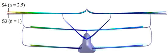 In a second time, the structural analysis is performed for an alternative (and likely unrealistic) flight condition, i.e., S4 (M = 0.7 at sea level) with an angle of attack α = 0°. Compared to the nominal cruise condition S3 of unitary load factor (n = 1), this flight condition entails an overall lift of around 2.5 times the BWA/SL’s expected maximum take-off weight (MTOW ~ 300–450 tons), thereby inducing a load factor n = 2.5. In such an extreme scenario, the maximum stress (Von Mises) recorded on the planform does not exceed 163 MPa, i.e., about 26% of the one reached by the CRM aircraft in its optimal cruise condition (n = 1). Moreover, the maximum deflection occurring at the tip of the third wing now becomes 1.06 m (see Figure 24), which represents roughly 35% of its CRM counterpart in cruise.