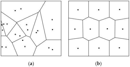 If the generation point in the Voronoi cell is equal to the centroid of the Voronoi area, it is called the centroid Voronoi partition (CVT). Figure 1a,b shows the Voronoi division and centroids, respectively, where the crosses in Figure 1a represent the Voronoi cell centroids and the points and irregularities are shown in Figure 1a,b. The polygons represent the spawning point and the corresponding Voronoi cell, respectively.