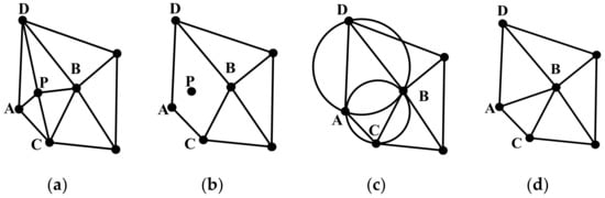 Based on the traditional CVT construction algorithm, the insertion construction method was introduced, so that in the original CVT configuration, when the robot number is reduced, all the triangles whose circumscribed circle contains new points are recorded, the common edges that affect the construction of the new triangle are deleted, and then new edges are re-planned, until all points are inserted. The specific process is shown in Figure 3a–d.