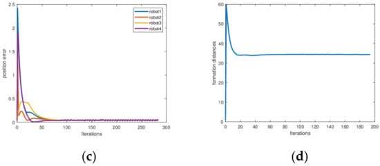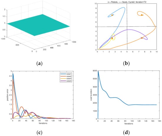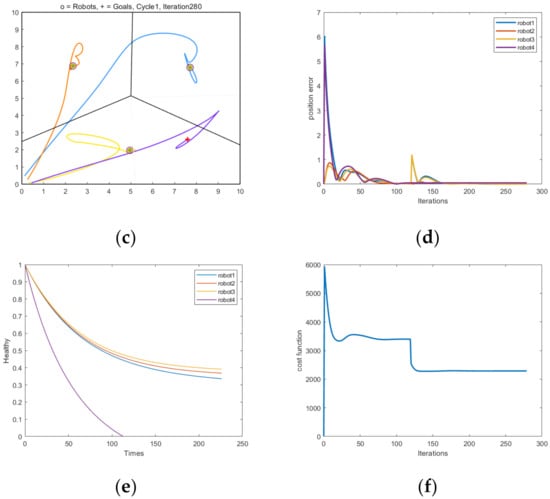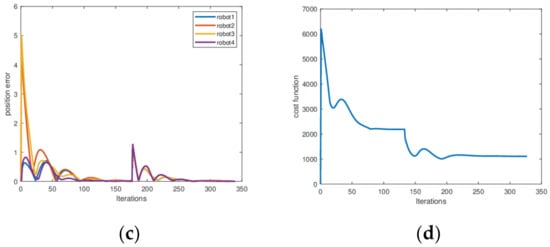 As shown in Figure 15c, when the number of iterations reaches 280, the remaining three robots adopt a new formation in the area and realize a new division of the area. The red plus sign in the figure is the final position of the faulty robot. The position error and cost function diagrams for this process are shown in Figure 15d,f.