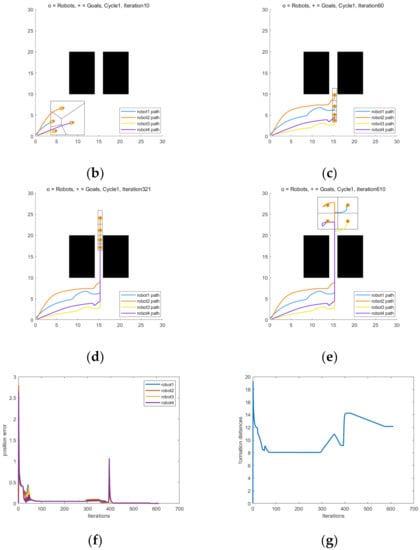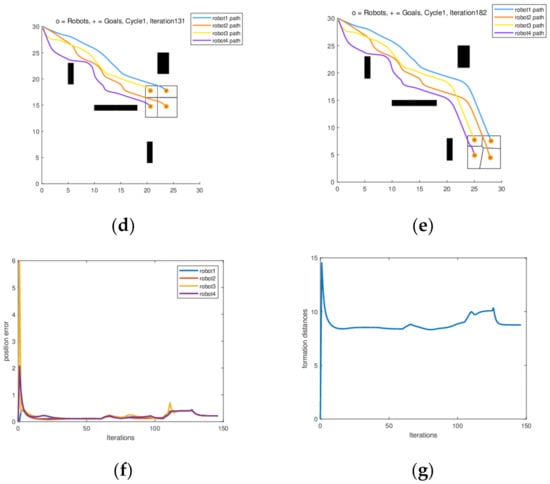 When hi(t) ≤ 0 due to other reasons, the robot is considered to be unable to work normally. In order not to affect the overall task of the formation, the insertion construction method was used to regroup multiple robots and re-divide the task area. Taking the square formation as an example, as shown in Figure 15a,b, four robots form a square formation before the number of iterations k = 120. After that, when the robot in the lower right corner cannot work normally due to a fault, and hi(t) ≤ 0, as shown in Figure 15e, the insertion construction method is used to make the other healthy robots adopt a new formation and reconstruct a new division of the new service area.
