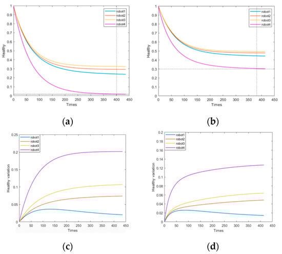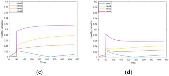As can be seen from Figure 13c, if there is no health optimization management the differences in robot health will diverge greatly with the passage of time, while in Figure 13d, the differences are small.