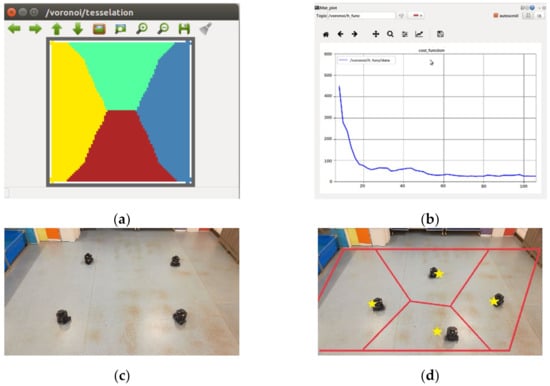 When the density function was set to a constant, the map was evenly divided into four generation points, as shown in Figure 17a. Figure 17c shows the initial positions of the robots. When the number of iterations k = 200, the CVT algorithm converges, as shown in Figure 17b. At this time, the cost function reaches the minimum value, and the robot completes the square formation on the map, as shown in Figure 17d.