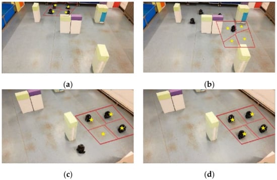 In the narrow channel scenario, the formation needs to be changed to pass through the obstacles. The robot is located in the lower left corner of the map at time t1. When the Voronoi division algorithm converges, the robot reaches the centroid position of each Voronoi cell, as shown in Figure 23a. At time t2, we change the size of the constraint area Q to transform the robot formation from a square to a straight line, as shown in Figure 23b,c. Finally, the robot formation reaches the designated position, as shown in Figure 23d.