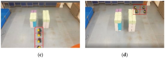 Multi-robot dynamic formation experiment with random obstacles: (a) t1 = 0 s; (b) t2 = 32 s; (c) t3 = 80 s; (d) t4 = 102 s.