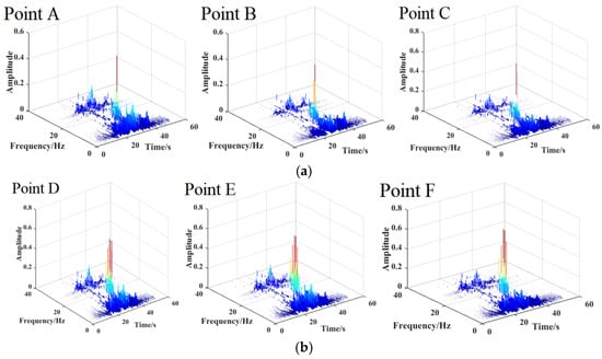 Taking points A–I of the three strata in Model 2 as examples, according to the analyses of their Hilbert energy spectra (Figure 15), the seismic Hilbert energy of the horizontally layered site is mainly distributed within 24–25 s and 7–13 Hz. It should be noted that the PHSA (peak Hilbert energy spectrum amplitude) is within 9–10 Hz, suggesting that the low-frequency band has a great influence on the seismic response of the horizontally layered site. Figure 15a shows that in the hard rock, the Hilbert energy spectrum of points A–C shows single peak characteristics, the spectrum amplitude near the PHSA is small, and the frequency component is not rich. When waves are transferred from Layers 1 (hard rock) to 2 (soft rock), the Hilbert energy spectrum characteristics near the interface between soft and hard rock masses show obvious changes. Figure 15b shows that the influence of the interface between Layers 1 (hard rock) and 2 (soft rock) on the wave energy transmission is mainly manifested as the change in frequency components near the PHSA. As waves pass through the stratigraphic interface, the frequency components around the PHSA become more abundant, from a single peak to multiple peaks, but the PHSA and its occurrence time and frequency are not basically changed. This is because refraction and reflection effects of waves occur near the soft rock/hard rock stratum interface due to lithology changes, leading to frequency components becoming abundant near the PHSA. In addition, to investigate the change in energy when waves propagate from bottom to top in the weak gravelly soil layer, the Hilbert energy spectrum of points G–I is shown in Figure 15c. When the wave enters Layer 2 (soft rock) from Layer 3 (gravelly soil), the shape and peak value of the energy spectrum above the interface between gravelly soil and soft rock change greatly. Compared with Layer 2, the PHSA of the seismic wave is significantly magnified from the bottom to the top of the gravelly soil layer, and the multipeak characteristics of the energy spectrum are more obvious. The frequency components near the PHSA of seismic waves become more abundant, and the energy spectrum amplitude near the PHSA shows a significant amplification effect. The amplitude of the Hilbert energy spectrum in the high-frequency band (28–36 Hz) showed an obvious amplification effect, but the appearance location of the seismic Hilbert energy peak had no basic change. This phenomenon suggests that the interface between gravel soil and soft rock magnifies the peak energy of seismic waves, but the interface has no effect on the appearance location of the PHSA of seismic waves. When waves propagate in the gravel soil layer, the energy spectrum amplitude of the peak value and its vicinity is significantly amplified, especially in the high-frequency band (f6–f8). This indicates that the horizontally layered site can be analysed from the perspective of high-frequency components. Compared with the soft rock, the characteristics of the Hilbert energy spectrum in gravelly soil are changed for the following reasons: gravelly soil is a multiphase medium, and the propagation of seismic waves in multiple media changes the characteristics of seismic energy transmission; compared with hard and soft rocks, gravelly soil has fewer constraints; meanwhile, as the surface is a free surface, the superposition effect of seismic waves appears near the ground surface, resulting in a greater displacement response of the top gravelly soil and changes in the shape of the Hilbert energy spectrum.