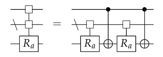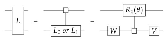 - Barenco, A.; Bennett, C.H.; Cleve, R.; DiVincenzo, D.P.; Margolus, N.; Shor, P.; Sleator, T.; Smolin, J.; Weinfurter, H. Elementary gates for quantum computation. Phys. Rev. A 1995, 52, 3457. [Google Scholar] [PubMed] [Green Version]