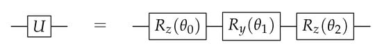 When a measurement is performed, the global phase () of the qubits does not influence the measurement probabilities. This means that all quantum gate operations can be represented by a matrix in [12]. These properties are used to decompose the matrix, using one of the algorithms described in Section 5.