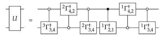 where denotes the ith number of the Gray code, and the gates are formed from the matrix for the Givens rotations. This results in the circuit shown in Figure 8 for the decomposition of a twp-qubit gate.