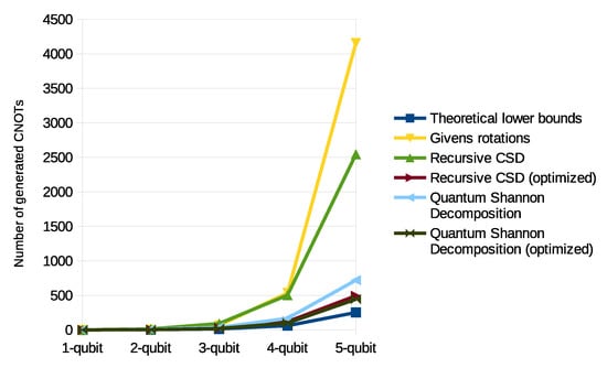 There is a theoretical lower bound for the number of CNOTs resulting from the decomposition of an n-qubit gate, and it is mathematically proven to be [15]. There are implementations that reach this number for one and two-qubit gates [15], as outlined in the next sections. This lower limit is included in the comparison, because it is useful to keep in mind what is and is not possible in terms of algorithms for unitary decomposition.