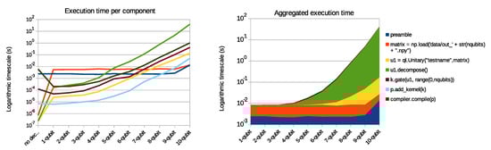 As expected, the decomposition itself took the most time—more than 10 times that of any other part. This is because of the considerable mathematical decompositions and the number of matrix operations. One of the algorithms used in the decomposition is eigenvalue decomposition, which is an iterative algorithm that requires operations for an matrix [25]. The data also show that the generation of the rotation gates and CNOTs does not contribute much to the total execution time of the algorithm, as expected. In addition, since the complete decomposition is calculated at design time, it does not influence the run-time of the final circuit when it is executed on a quantum accelerator.