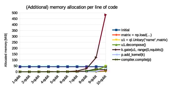The program in Code Listing has been used to determine the execution time and memory used by the decomposition. Unitary matrices of sizes to were randomly generated first, using QiBAM as outlined in Section 2. The matrices were stored as binary files and loaded as required for the decompositions. The decomposition was repeated 1000 times for the smaller gates and 100 times for the decomposition of the 10-qubit gate in OpenQL, with varying numbers for the intermediate sizes. The execution time and memory use as reported in this paper are the averages of these runs.