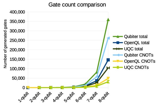 To obtain the total gate count, we use the number of lines in the output quantum assembly, which also includes rotation gates and not just CNOTs. The results for OpenQL, Qubiter and UQC are plotted in Figure 15. All of the implementations use an exact decomposition algorithm and therefore generate a constant number of gates for each size of the (non-sparse) input matrix.