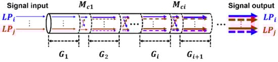 In our model, an erbium-doped fiber (EDF) comprises multiple gain segments and coupling matrices, as shown in Figure 1. We assume that there are K independent sections, each of which is modeled as an individual amplification gain matrix (G1, G2,…, GK). Distributed MC can be viewed as a large number of random matrices (M1, M2,…, MK−1), randomly located before and after each independent section. The TM of the proposed FM-EDFA is given by: