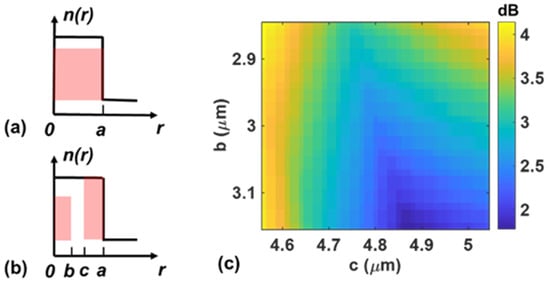 Refractive index profile and Er-dopant distribution of (a) the Type-A and (b) Type-B 6-mode EDFs (the shaded region represents Er ion doping). (c) DMG of Type-B 6-mode EDFA as a function of b and c.