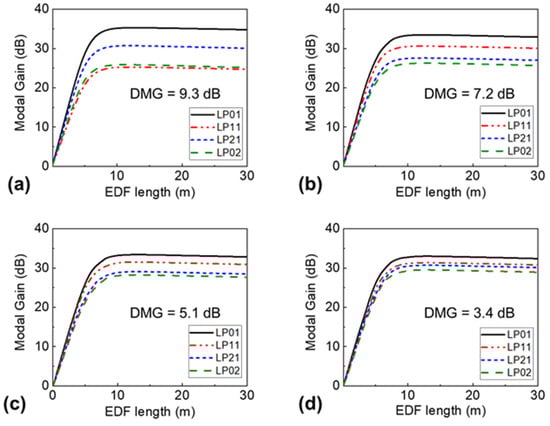 To study the role of mode mixing in reducing the DMG in FM-EDFAs, we compared the DMG of a Type-A 6-mode EDFA with and without strong MC. Figure 3 shows MG as a function of EDF length at a pump power of 1 W, which is much higher than the signal power of 0.1 mW mentioned in Section 2. In an uncoupled case (Figure 3a), MG gradually increases until saturation point at ~12 m and the overall DMG of the amplifier is reached at ~9.3 dB. In a strong mode coupling regime (Figure 3b–d), however, a 6-mode EDFA can obtain a much lower DMG by increasing the degree of the MC, equivalent to increasing the CS or NCP. For example, as shown in Figure 3d, the DMG is reduced to 3.4 dB when NCP and CS are 600 and −10 dB/pt, respectively, which is 5.9 dB lower than that in Figure 3a.